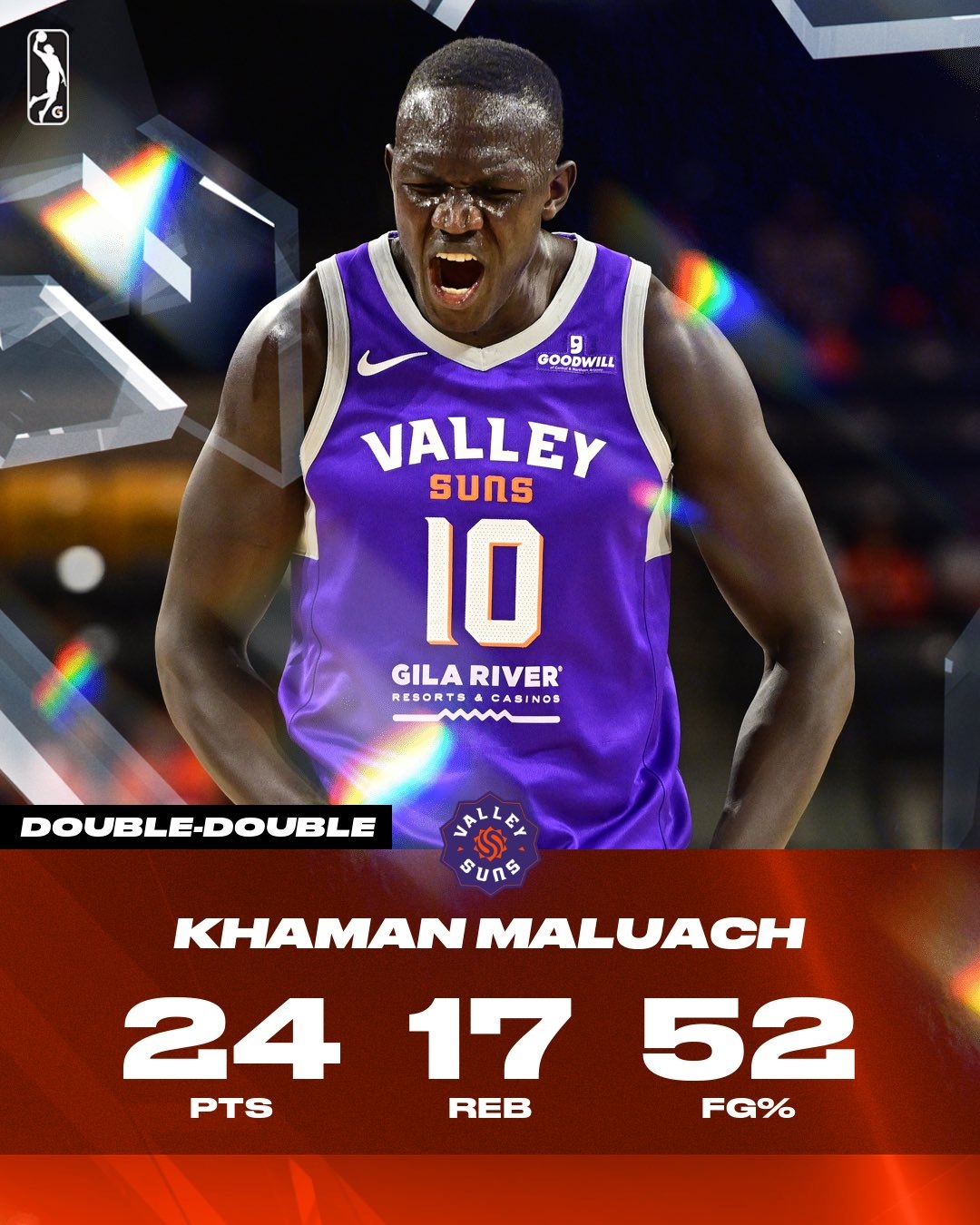 03月01日讯 NBA G联盟常规赛,太阳下属球队山谷太阳在客场以112-105击败独行侠下属球队得克萨斯传奇。此役,太阳10号秀、中锋马卢阿奇表现不俗,2米16的他甚至还秀起了砸篮板接球暴扣的好戏。全场比赛,马卢阿奇上场34分钟23投12中,三分4中0、罚球2中0,砍下24分17篮板1助攻1抢断2盖帽,其中有8个前场篮板。...