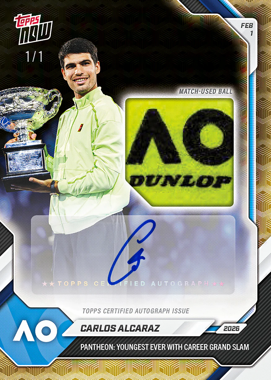 此外,TOPPSNOW今天也推出了阿尔卡拉斯的全满贯纪念卡,同样的,如果你能找到这张1/1的签字卡片,你还会获得决赛用球的物料切片。同时,这次发行的卡片还包含了一张变化版选图。