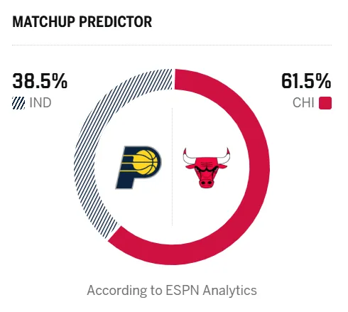 赛前,美媒ESPN预测本场比赛,步行者胜率38.5%,公牛胜率61.5%。